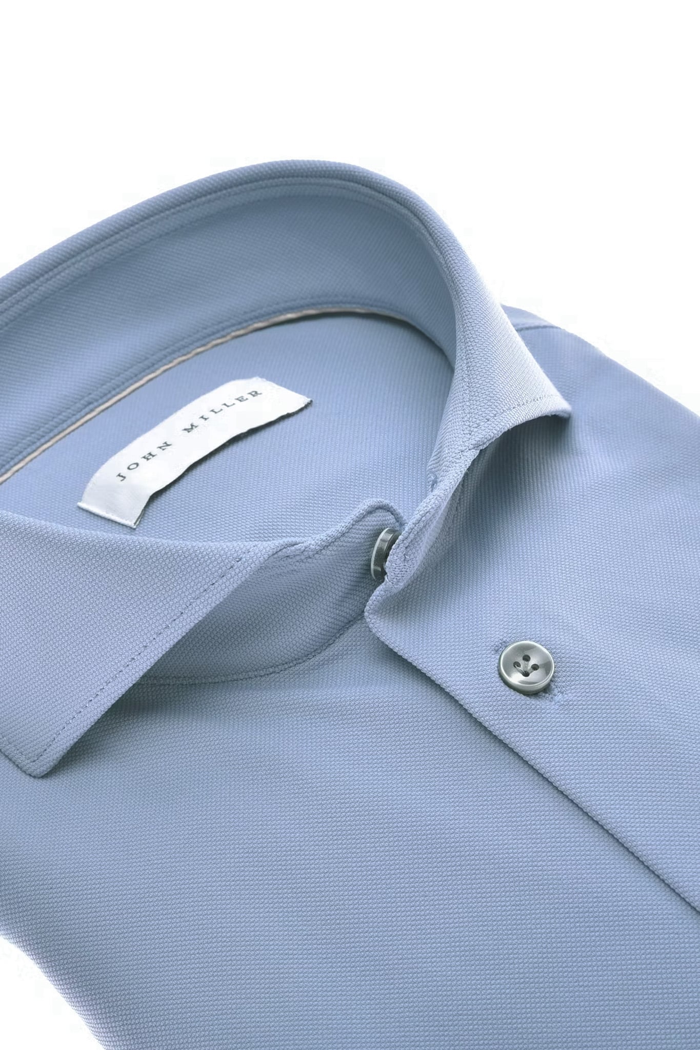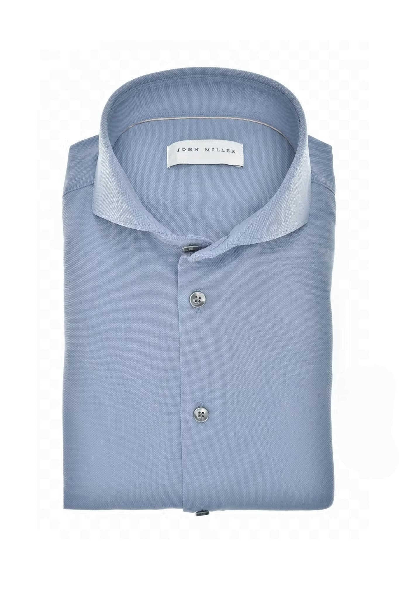 Dieses blaue Slim-Fit-Hemd ist aus Hyperstretch-Material gefertigt. Die Slim-Fit-Hemden von John Miller sind schmal geschnitten und betonen die Figur. Das Hyperstretch-Material bietet stilvollen Tragekomfort. Dieser italienische Strick hat sich seit Saisons als Bestseller in den John Miller Kollektionen bewährt. Der modische, graublaue Farbton wird durch graue Knöpfe abgerundet. Das Hemd hat einen stilvollen Haifischkragen mit nach hinten ausgeschnittenen Kragenspitzen. Die linke Manschette ist mit einem dezenten, gestickten Logo versehen.