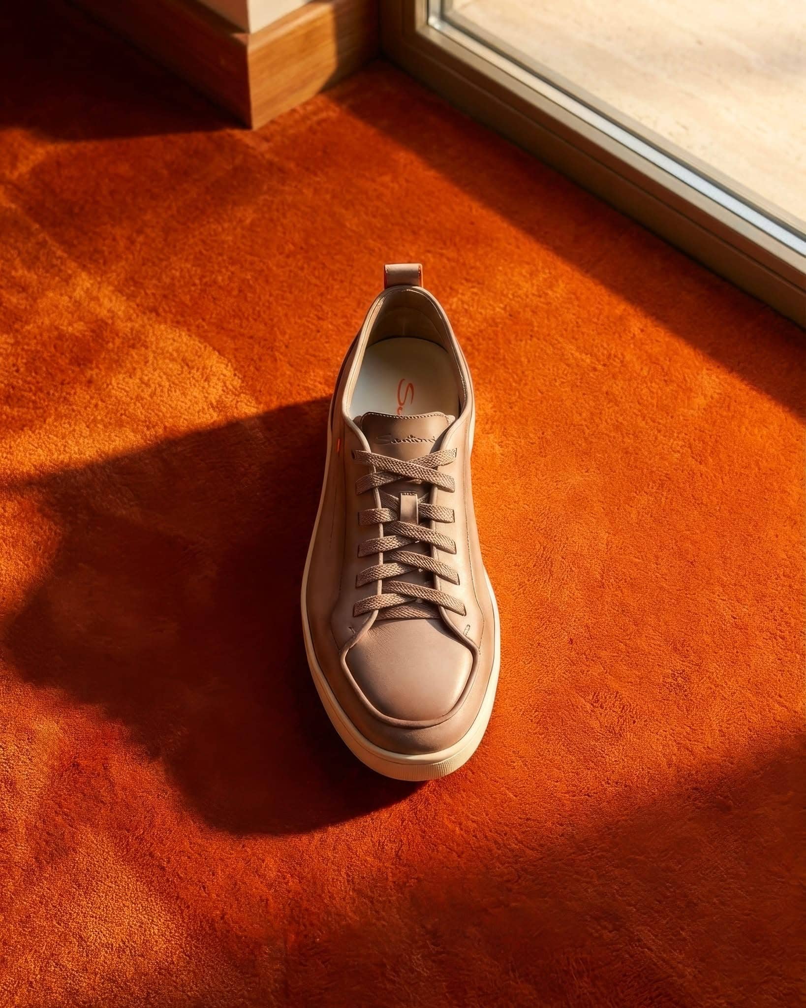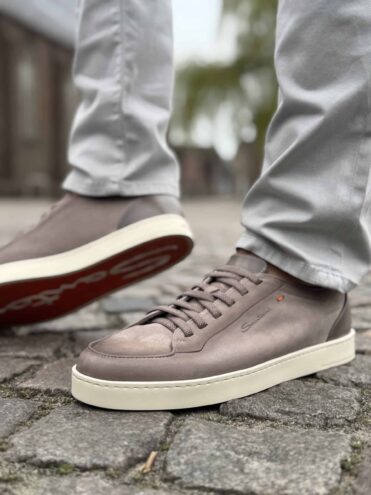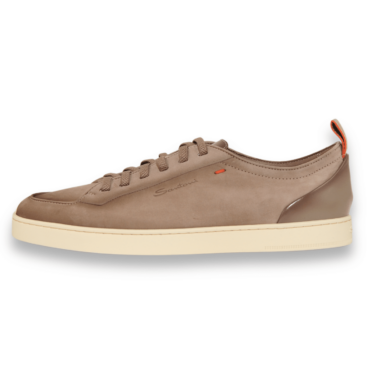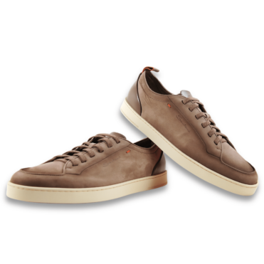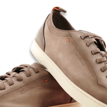 The sporty comfort of this sneaker, combined with the understated elegance of a timeless lace-up shoe. The shoe is crafted from exceptionally soft and lightweight Carezza nubuck leather, hand-treated with the Velatura color gradient and featuring subtle Sigillo stitching in Arancio Santoni – the signature orange shade. The shoe is finished with a heel pull tab and elastic laces, making it easy to put on and take off.