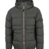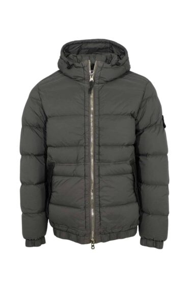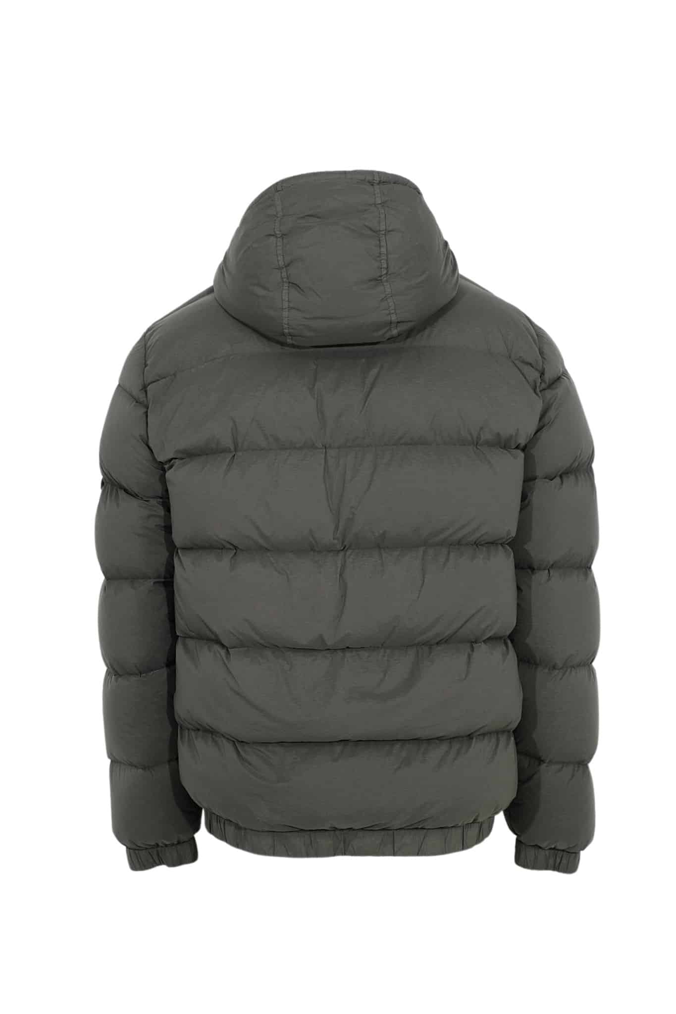 Hooded down jacket in a light stretch nylon single layer fabric undergoing a special weaving technique automatically creating the feather compartments directly from the loom. The seamless feather tunnels substantially increase the hold of the down. The finished garment is padded with direct injection with the finest feathers, specifically treated to resist garment dyeing. Garment dyed with the addition of a special anti-drop agent. RDS – Responsible Down Standard certified.
